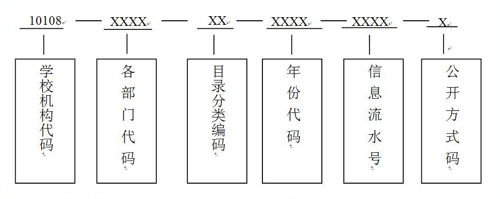 为一组20位的编码,由学校机构代码、各部门代码、目录分类编码、年份代码、信息流水号、公开方式码共计20位字符组成,具体表现形式为:
